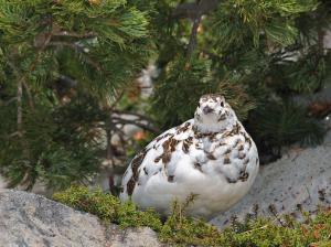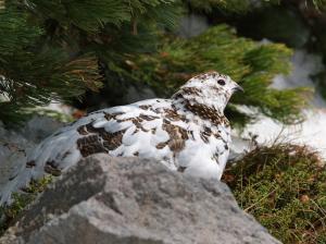 巡視二日目で天気は昨日の快晴に比べて雲が多くなりましたが、今日もライチョウと遭遇しました。こちらは♀です。