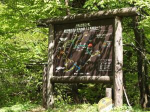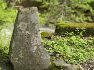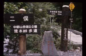 島々谷から徳本峠を越えて上高地明神に至るコースは二俣まで林道を歩きます。最近、事務所で発見したスライドに二俣の案内板の古い写真がありました。昨年のウエストン祭記念山行で歩いたときにはこの石碑に気がつかなかったので、気になっていました。昨日、花の撮影のついでに調べたら、確かにありました。北沢に至る道はトンネルになっており、古い写真の道は既になく背景は砂防ダムになっていました。