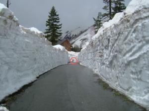 ロープウェイから栂池自然園へ向かう道が除雪されており、雪の壁ができています。奥に見える赤い○が人です。雪の壁は4?5mあり、例年に比べて2倍とのことです!