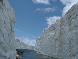 雪の壁からのぞく青空が雪の白色と映えてとても綺麗です。