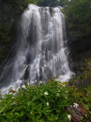 滝の前には花が咲いていていますが、水しぶきがかかっていました。