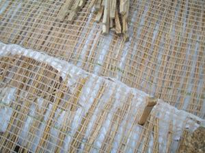↓再生マット(麻・わら・紙の三層構造)を竹釘で留めます