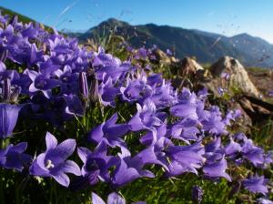 ↓夜露に濡れたイワギキョウの群生(奥の山は鷲羽岳)