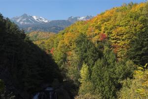 ↓「善五郎の滝」付近の紅葉と乗鞍岳