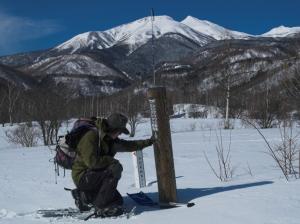 乗鞍高原一の瀬園地の積雪調査を13日に行いました。1月と違って、雪の表面がザラメになっていました。三連休の後だったのでトレース(足跡)がたくさんついていて、歩くのに苦労はしません。しかし、本当に景観の良い場所にはトレースが残されていませんでした。少し、もったいない気がします。