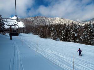 2月25日開催予定の自然観察会の下見に、昨日(19日)乗鞍高原温泉スキー場に行きました。自然観察会はスキー場上部の三本滝平からネイチャーエリアコースをスノーハイクするため、登りにリフトを使用します。平日ということもあって、ゲレンデのスキーヤーの数が少なめでした。これだけ天気が良くて、雪質がいいのに”もったいない”。ゲレンデは圧雪車で整備されていますが、スノーシューを付けての散策コースは雪がふわふわしていました。