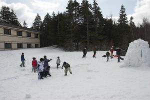 ↓休憩後に、昨日作った雪の家(イグルー)の横で雪合戦