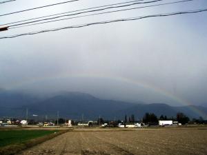 今朝は春の嵐のような風雨が強い朝でした。家を出て気が付いたのが写真の虹、時間ぎりぎりにアパートを出たのでゆっくりと撮影出来ませんでした。安曇野でもそろそろ花の咲く季節です。もう少し時間にゆとりをもって暮らしていきたいですね。