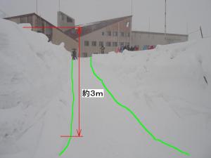ホテル立山前の遊歩道です。通路がわかりにくいので緑の線で書いてみました。雪の壁で一番高いところでは約3mぐらいありました。