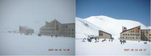 左の写真はホテル立山(室堂バスターミナル)前の全景。暴風雪気温+2度。