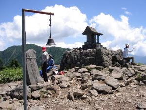 根子岳頂上にてくつろぐ登山者。手前にある鐘は鳴らすとかなり大きく響き渡るので、たぶん登山口まで聞こえるのではないでしょうか。