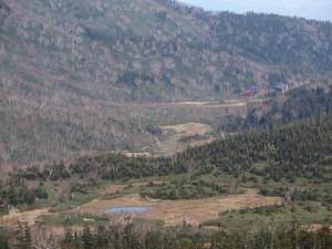 手前から浮島湿原・ワタスゲ湿原・水ばしょう湿原・ビジターセンター。