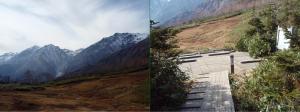 (左:展望湿原からの白馬連峰 右:展望湿原休憩所)