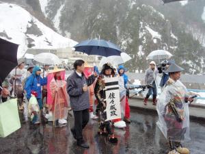 去年はアルペンルートの開山祭の出席でしたが、今年は4月10日に行われた立山黒部アルペンルートオープンカーニバルに出席してきました。この行事は立山黒部アルペンルートの大町側の開通を祝う式典で、メインイベントとしてエキストラによる佐々成政(富山城主)の雪中行軍を再現していました。