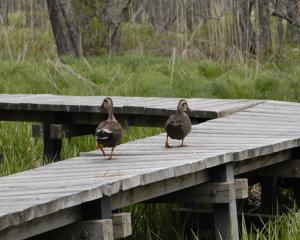 カルガモも春の芽吹きを楽しみながら木道を散歩です。