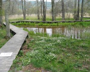 沈砂池周辺と湿原遊歩道(木道)です。池の中にはクロサンショウウオの卵嚢が所々見られます。周りにはイチリンソウなどの野花が沢山咲いていました。