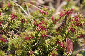 一部雪が溶けた所に早くもガンコウランの花が咲いていた、秋になると黒い実になりライチョウが好んで食べている植物