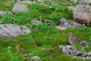 ライチョウ親子が新鮮なお花を食べにやってきました。好奇心旺盛なヒナは怖いもの知らず。よちよち歩く後から、母鳥が周囲を警戒しながらついてきます。彼らに出会っても近づいたりせず、そっと見守ってあげてください。