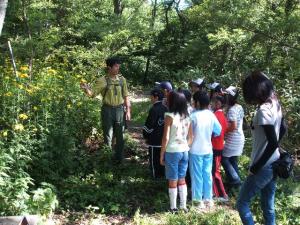 まずは、平湯の秋本自然保護官から活動内容について説明。繁殖力が強く在来種を駆逐してしまうことから特定外来植物に指定されているオオハンゴンソウは、平湯に限らずあちこちで勢力を拡大しています。子供たちの身長を上回るほどに成長し、ちょうど今が開花時期なのでよく目立ちます。