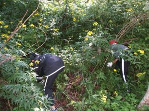 藪に分け入って除去作業。地下茎でも繁殖するので、根っこが切れないよう丁寧に抜き取ります。泥にまみれ、汗水たらして頑張りました。抜き取ったものは、根っこ部分を切り離し、乾燥させて完全に枯死させてから焼却処分という手順を踏まなければなりません。