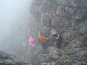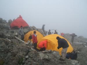 山荘横のキャンプ場。この悪天候にもかかわらずテントで頑張る人たち。写真ではなかなか伝わりませんがかなりの強風です。息を吸わなくても勝手に空気が喉の奥まで入ってきます。そして霧の向こうはがけっぷち。こんな時は山荘に泊まってほしいところです。