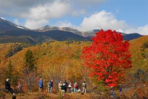 一の瀬牧場にぽつんとたたずむ大カエデ。この時期だけは注目の的となります。昨年テレビで放映されたことで一躍有名になりました。この一本を見るために今日も多くの人が訪れていました。数あるカエデの中でも、こちらはコハウチワカエデという種類だそうです。「カエデ」という名の由来は、葉がカエルの手のような形をしているためだとか。