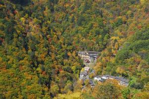 こちらは白骨温泉。乗鞍高原からスーパー林道B線を沢渡方面へ下る途中からの眺めです。温泉街が紅葉にうずもれている感じですね。乗鞍高原も白骨も、良質な温泉と紅葉を同時に楽しめる贅沢なところです。深まる秋を満喫しに来ませんか。