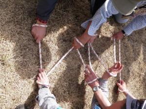 「ロープを使った担架(ロープを掴む手は離れないように手首に巻いた形にしています。)」