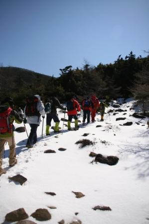 トーミノ頭から草すべりという名前のついた傾斜面では雪がまだまだあるのでアイゼン・ストックを握りしめ“ちょこちょこ”歩きになっていました。やはり標高が2000m以上ですので雪がまだまだ残っており寒いです。