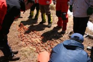 もう1班と火山館で合流し、小諸消防署職員の方より救助訓練の講習を受けました。担架での救助や、紐を使った救助の方法などを教えていただきました。山岳地帯での救助は、道幅も狭いですし危険も伴うので時間も救助に関わる人もかなりの数必要になるそうです。登山はとても楽しいですが、無理をしてまで登らず自分の体と相談して楽しみましょうね。