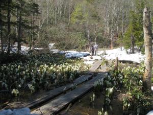 ロープウェイ乗り場付近の池唐ではすでにミズバショウの開花が始まっています。このあたりの個体は自然園の個体よりも倍以上に成長(緑の葉の部分)しますので、見応えある開花を楽しめます。