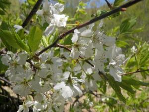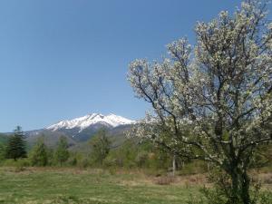 雄大な乗鞍岳を眺めながら、のどかな牧場をのんびり歩きます。満開を過ぎたけれどスモモの花がまだ楽しめました。