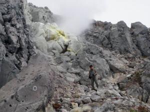 新中尾峠にある焼岳小屋を過ぎると間もなく森林限界に達し、殺伐とした岩の世界。硫黄の臭いが漂ってきて、生きた火山の息遣いが感じられます。