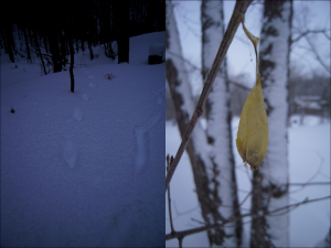 左側の「テン・テン・テン」と見えるのは“ある動物”の足跡です。ダレの足跡でしょうか(足跡が見やすくなるよう画像の状態を暗くしてあります)?続いて右側、これはミズナラの木の枝にくっ付いていたある昆虫の“お家”です。まるで、葉っぱのようで見落としてしまいそうでした。