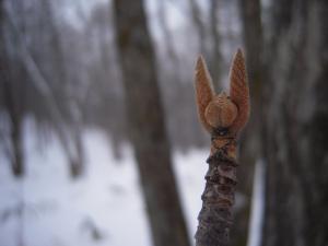 ある植物の“冬芽”です。まるで空に向かって手を伸ばしているように見えませんか。え?ウサギの顔にもみえる?ほんとですね。さぁ、分かった方はいらっしゃるでしょうか?まだ答えは発表しませんよ~。