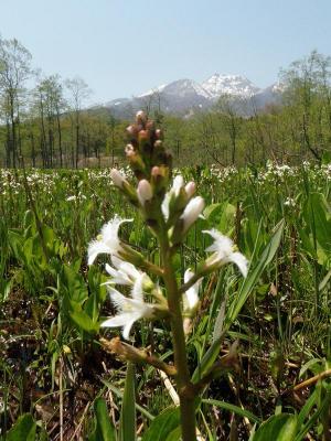 ミズバショウの輝く緑葉の前には、花びらに細かい毛が生えていて日にキラキラ輝いて見える白いすてきな花がたくさん咲いていました。調べてみると、氷河期の生き残り「ミツガシワ」でした。寒いところが大好きな植物だそうです。上から見ると葉っぱが3枚きれいに三方に分かれて「三ツ柏」の紋章に似ているところから、この名がついたとのこと。これから見頃を迎えますので、しばらくは訪れる方の目を楽しませてくれると思います。ミズバショウ以外にも四季折々を楽しめるのが妙高高原の大きな魅力です。