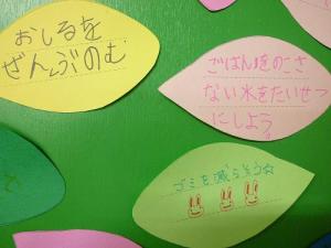 さまざまな環境宣言の中で、わたしの心に残ったものはというと、「おしるはぜんぶのむ」とひらがなで書かれた環境宣言。書いたのは確か小さな女の子。おかあさんに、残したお汁を下水に流すと、川や海が汚れるのよ」なんて教わったのかな、なんていう微笑ましい想像が膨らんでいきました。