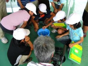(みんなで、水温を計測。テレビ局も来て、ちょっぴり緊張?!)