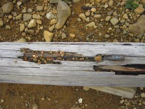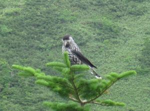 ハイマツの実を木の溝に置いて安定させ、種子を突っつきだして食べていたようですね。周囲にはハイマツの実のかけらが散乱していました。