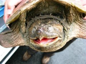 <長野県内で捕獲されたカミツキガメ。大型に成長し、色々な生物を補食する。極めて長寿で、繁殖能力も高い。>