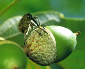ハイイロチョッキリは、本州・四国・九州と広く分布しており、8月~10月頃に出現します。青くてまだ木の実が柔らかい内に、長ーい口を使って穴を開け、中に卵を産み付けます。そうすれば、秋になって幼虫が生まれる頃には、木の実も固くなり外敵から身を守ることができるわけです。そうして、幼虫は安全な場所で、たっぷりの栄養に囲まれながら快適に成長していけるんです!賢い!!