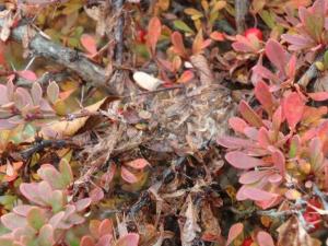 (下の画像は植樹であるメギに作られた希少種であるミヤマシロチョウの越冬巣。ミヤマシロチョウは幼虫で越冬します。)