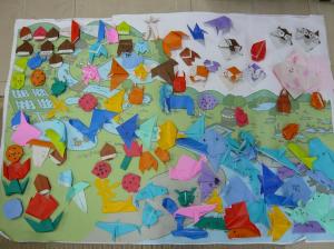 そして折ったおりがみを森、川、海を背景にした台紙に貼ってもらったところ・・・、