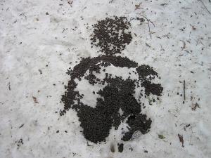 <カモシカのフンです。雪形(ゆきがた)ならぬ糞形、私には人が跳ねているように見えます>
