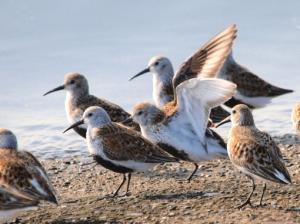 藤前干潟を代表する旅鳥のひとつハマシギは、冬羽は、ぼんやりとした灰褐色だったものが、頭頂と背からの上面の羽縁が赤褐色、風切が黒褐色にかわり、一段と色が濃くなったオスは、どこか守ってくれそうでもある。