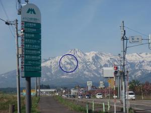 そんな連休明けの5月9日月曜日。気温はぐんぐんあがり、朝からぽかぽか陽気。出勤途中、快晴の空のもと妙高山の外輪山に少し太り始めた雪形「跳ね馬」が、あまりにくっきり浮かんでいたので、車を脇にとめて降りてみました。