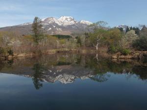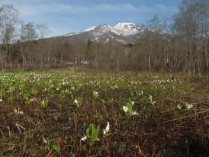 妙高山の雪形「跳ね馬」といもり池のミズバショウ
