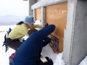 壁面を雪から掘り出し、釘で打ちつけたり、両面テープで貼り付けたり、ひもでくくりつけたり・・・設置場所によって方法は臨機応変に対応できるよう、道具はいろいろ準備しておきました。