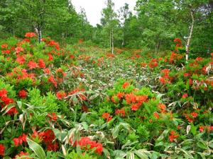 レンゲツツジの燃えるような赤に対比して、登山道沿いには