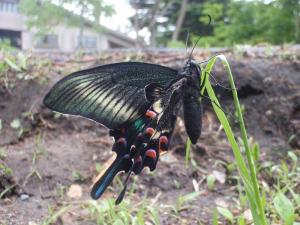 この三週間で出会った生きものは、工事現場に現れた「ニホンリス」の子どもやいもり池を飛び回るトンボの「コサナエ」、車の前に飛び出してきた「モリアオガエル」やひらひらと舞う「ウスバシロチョウ」「アサギマダラ」など様々でしたが、一つだけご紹介。